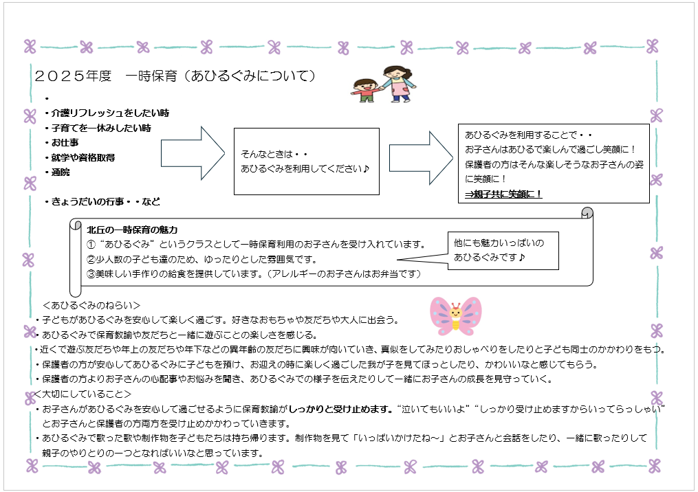 北丘聖愛園では産休明け・育休明け保育、延長保育、一時預かり事業(幼稚園型)や、一時預かり事業(一般型)、子育て広場の開催など、地域の子育て・子育ちも応援しています。