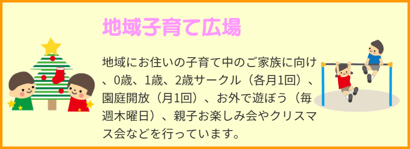 0歳サークル「ぴよぴよ」、1・2歳サークル「こっこ」など、いろいろな子育て広場の場を提供させていただき、地域の子どもたちが伸びやかに育つお手伝いをします。
