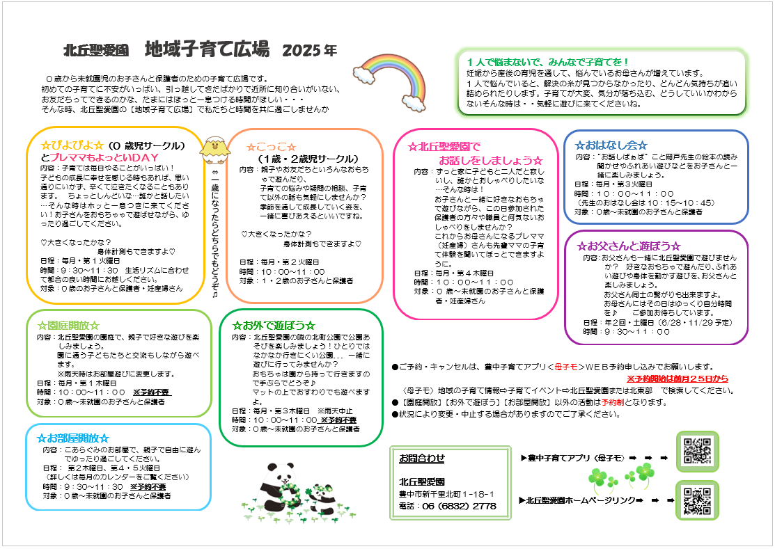 北丘聖愛園では産休明け・育休明け保育、延長保育、一時預かり事業(幼稚園型)や、一時預かり事業(一般型)、子育て広場の開催など、地域の子育て・子育ちも応援しています。