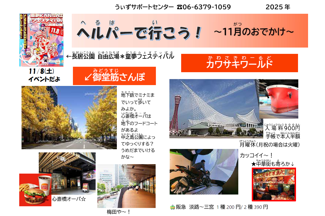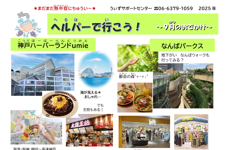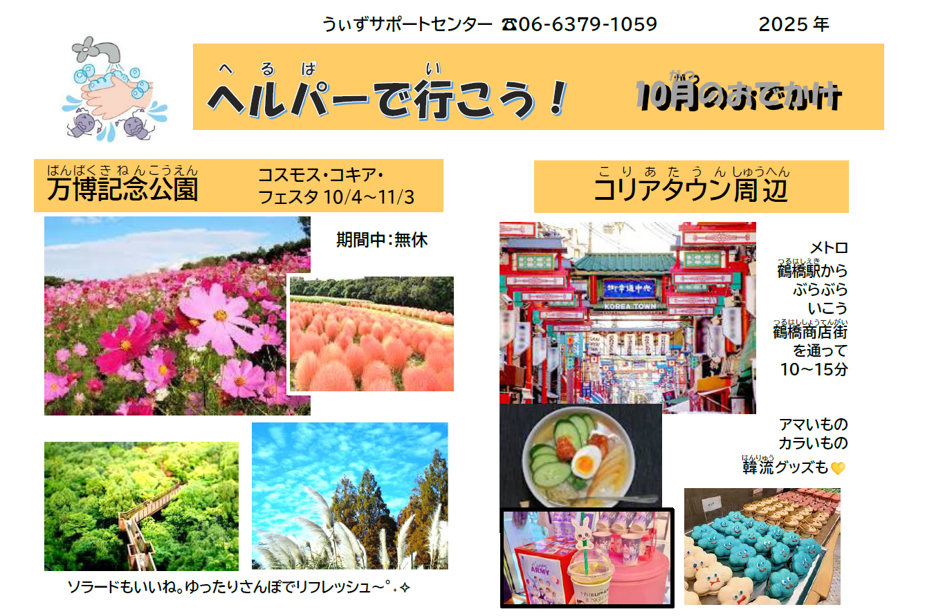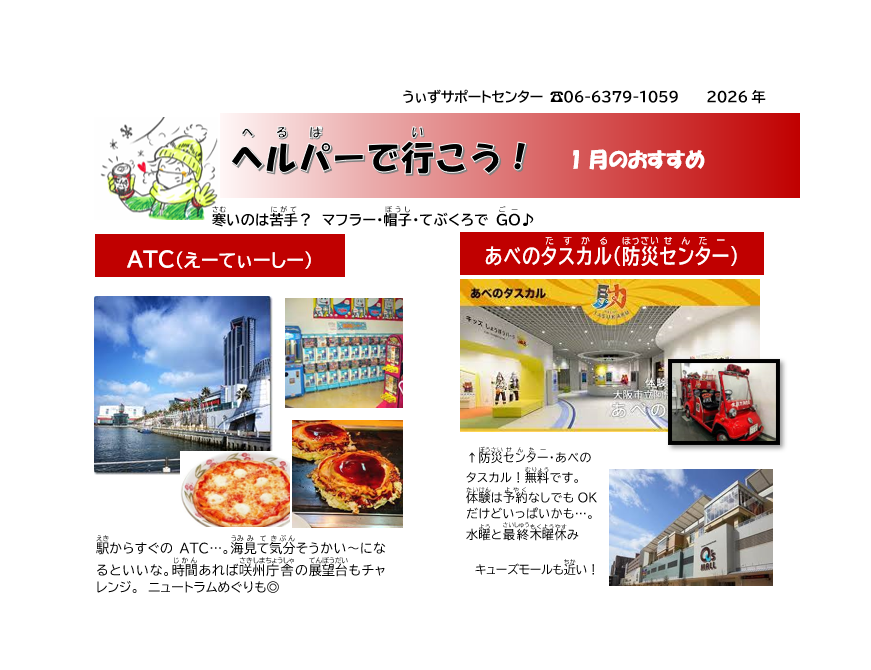 「ヘルパーでいこう」は毎月、行き先をピックアップして発行しているプチ情報誌です。どこに行こう…?と悩んでいる時の参考にしてもらっています。自分に合った場所があるといいですね。臨時休館や閉店などもありますので、詳細はあらためてお調べ頂きますようお願いします。
